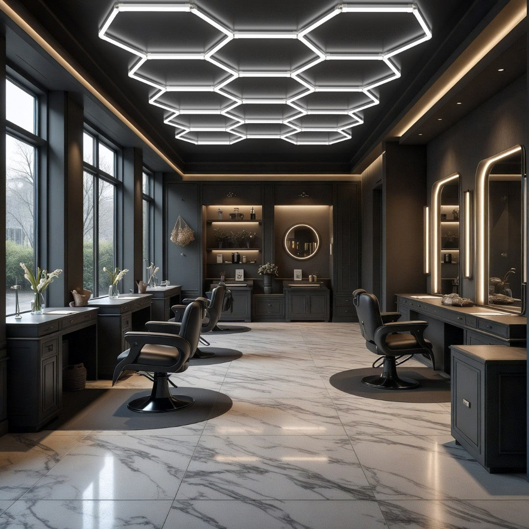 Son design hexagonal, inspiré des motifs sportifs, en fait également un excellent choix pour un magasin de sport ou un concept store. Il trouve aussi toute sa place dans un studio de tatouage, un salon de coiffure ou un espace événementiel où la lumière est un élément décoratif fort.