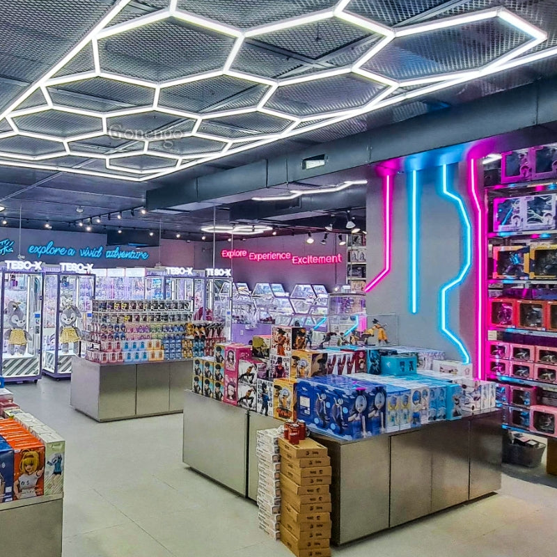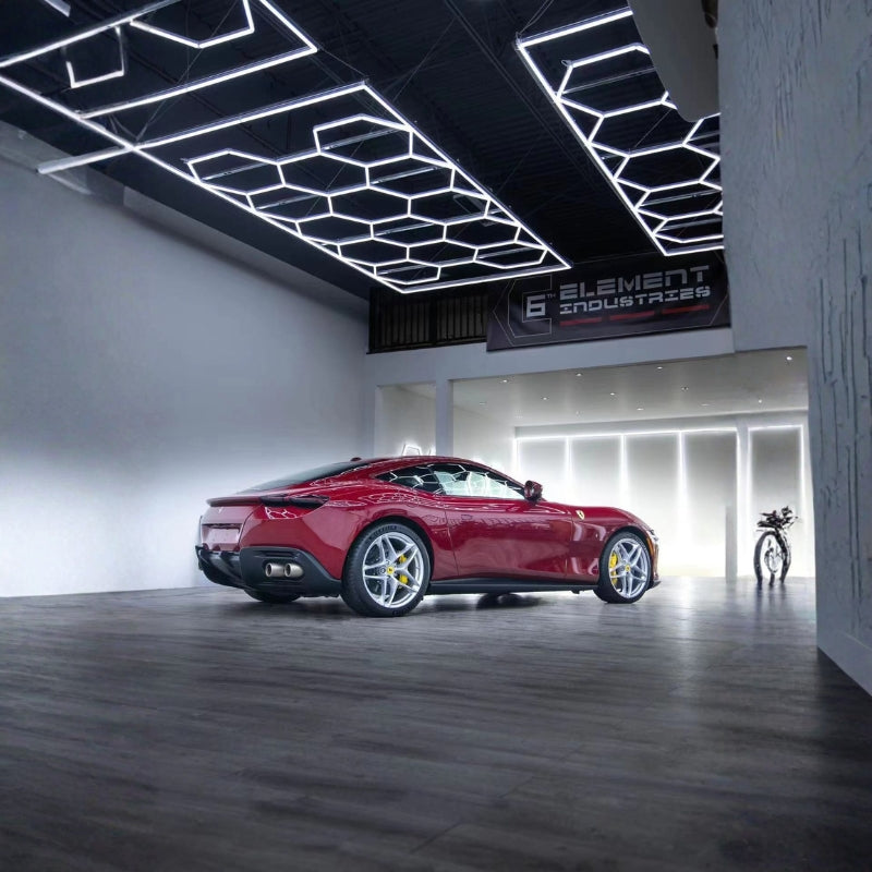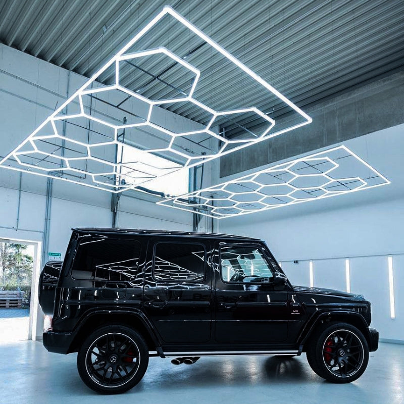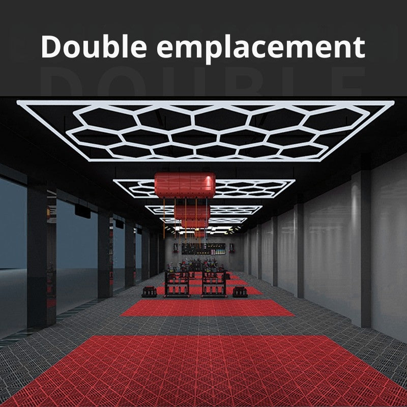 Avec ses dimensions 244 x 485 cm et sa forte puissance, ce kit est idéal pour les grands espaces intérieurs : showrooms (auto/moto), ateliers de detailing, halls, boutiques premium, studios ou zones de démonstration. Son design hexagonal devient un repère visuel fort et contribue à l’identité du lieu, tout en offrant une solution durable grâce à sa garantie 2 ans.