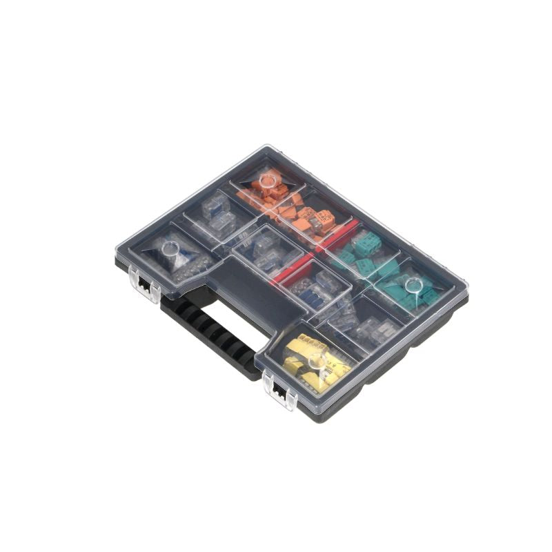 Kit 109 pièces mêlant connecteurs push-in (insertion directe) et connecteurs à levier (réutilisables), assorti pour couvrir l'essentiel des configurations d'un chantier d'appartement. Format compact permettant un transport facile dans une caisse à outils.