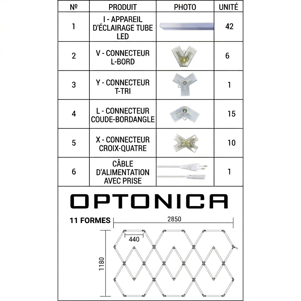 La configuration heptagone en 11 modules forme une structure allongée couvrant près de 3 mètres de long. Le montage modulaire reste accessible malgré la taille imposante. Kit livré complet avec fixations et connecteurs. Protection IP20, certification CE & RoHS et garantie 2 ans Optonica.