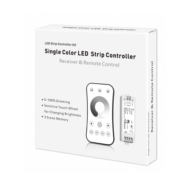 Pilotez vos rubans LED monocouleur sans fil grâce à ce kit récepteur + télécommande compacte CR2032. Le récepteur accepte une tension de 5 à 36V DC et gère jusqu'à 288W sur un canal de 8A. La télécommande offre une molette tactile pour varier la luminosité avec une résolution de 4096 niveaux, 3 mémoires de scènes, 4 paliers de luminosité rapide (25/50/75/100%) et une entrée Push-Dim (appui court = on/off, appui long = variation progressive) pour interrupteur poussoir filaire. Certifié CE RoHS FCC, garanti 5 ans.