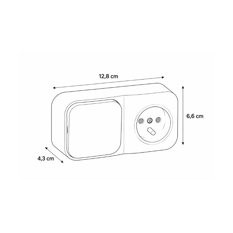 Tension 250V 50 Hz, intensité 16A pour la prise. Standard français 2P+T avec broche de terre. Format 128 x 66 x 43 mm. Indice IP20 pour usage intérieur sec. Bornes à vis. Obturateurs enfants intégrés à la prise.