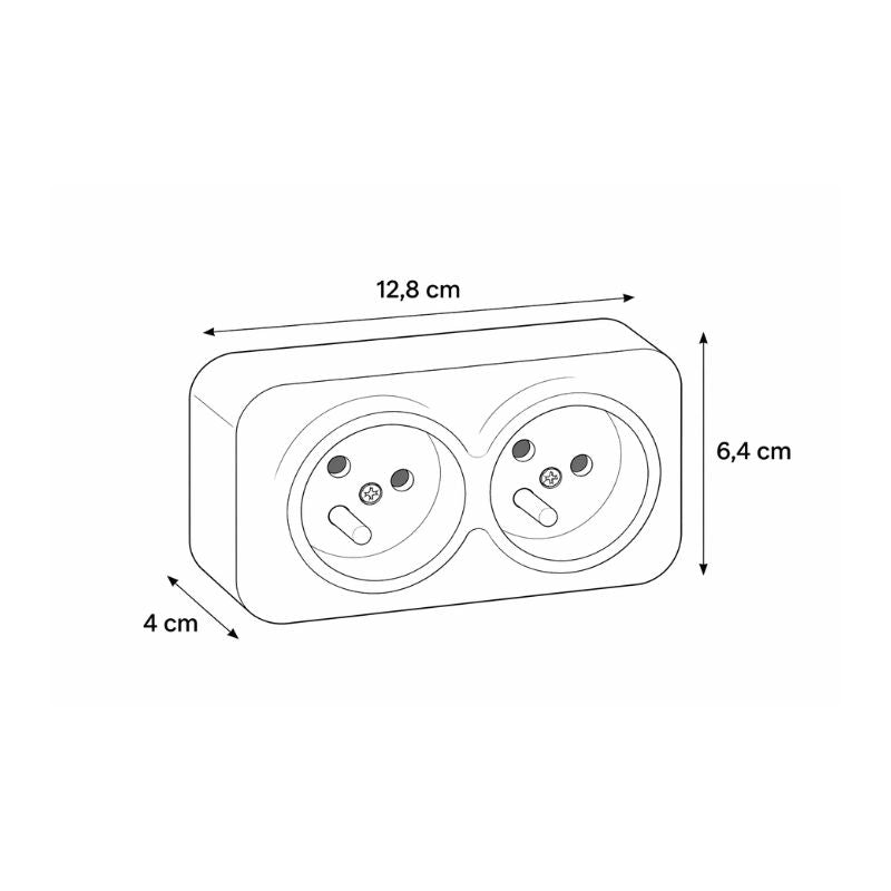 Alimentation en 230V AC / 50Hz et intensité nominale de 16A par sortie. Le bloc propose une double prise 2x(2P+T) avec broche de terre saillante sur chaque emplacement. Ses dimensions sont de 128 x 64 x 40 mm pour un indice de protection IP20 destiné aux locaux intérieurs secs. Le raccordement s'effectue par bornes à vis acceptant les conducteurs rigides ou souples jusqu'à 2,5 mm².