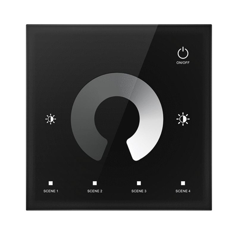 Prenez le contrôle de vos rubans LED monocouleur avec ce variateur mural tactile en verre trempé noir. Alimenté en 12-48V DC, il pilote jusqu'à 288W de rubans LED via deux canaux de sortie (5A par canal en 12-24V). Sa molette tactile centrale offre un réglage précis de la luminosité sur 10 niveaux, et ses 4 touches de scènes mémorisent vos ambiances préférées. Compatible avec une télécommande RF 2.4GHz optionnelle pour un pilotage à distance. Certifié CE RED, garanti 5 ans.