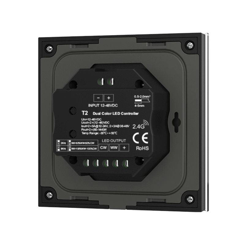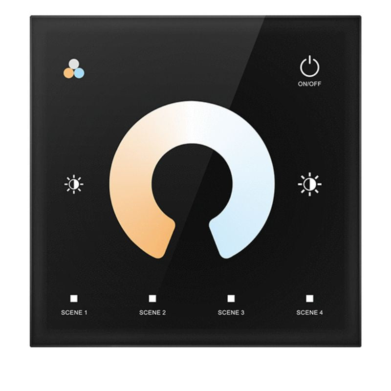 Contrôlez à la fois la luminosité et la température de couleur de vos rubans LED CCT depuis ce panneau mural tactile en verre trempé noir. Il fonctionne en 12-48V DC sur 2 canaux de 5A chacun (120-288W) et propose une molette de température de couleur, un réglage de luminosité, 4 scènes programmables et une commutation rapide entre blanc chaud, blanc neutre et blanc froid. Un double DIP switch permet d'ajuster la fréquence PWM et le mode blanc neutre. Certifié CE RED, garanti 5 ans.