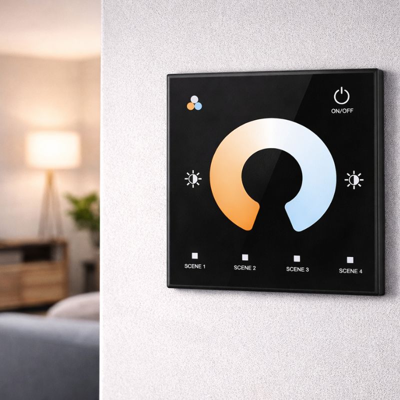 Ce variateur est conçu pour les rubans LED CCT (bi-couleur blanc chaud + blanc froid) dans les espaces résidentiels et professionnels : bureaux, salons, cuisines, commerces, hôtels. Le réglage continu de la température de couleur permet d'adapter l'ambiance à chaque moment de la journée, tandis que le contrôle de luminosité reste totalement indépendant.