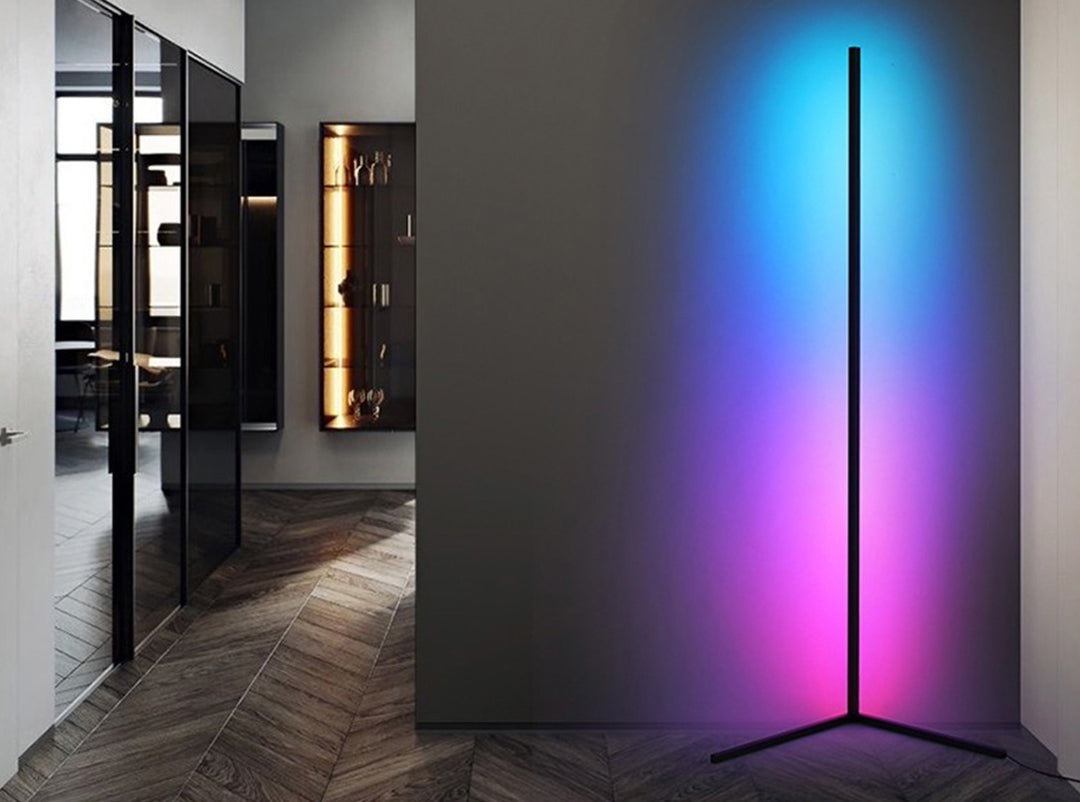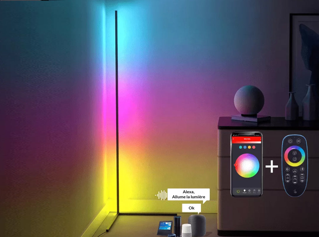 Lampe sur pied moderne et discrète. Lumière très agréable, pouvant être ajustée tant par la couleur, que par l'intensité.